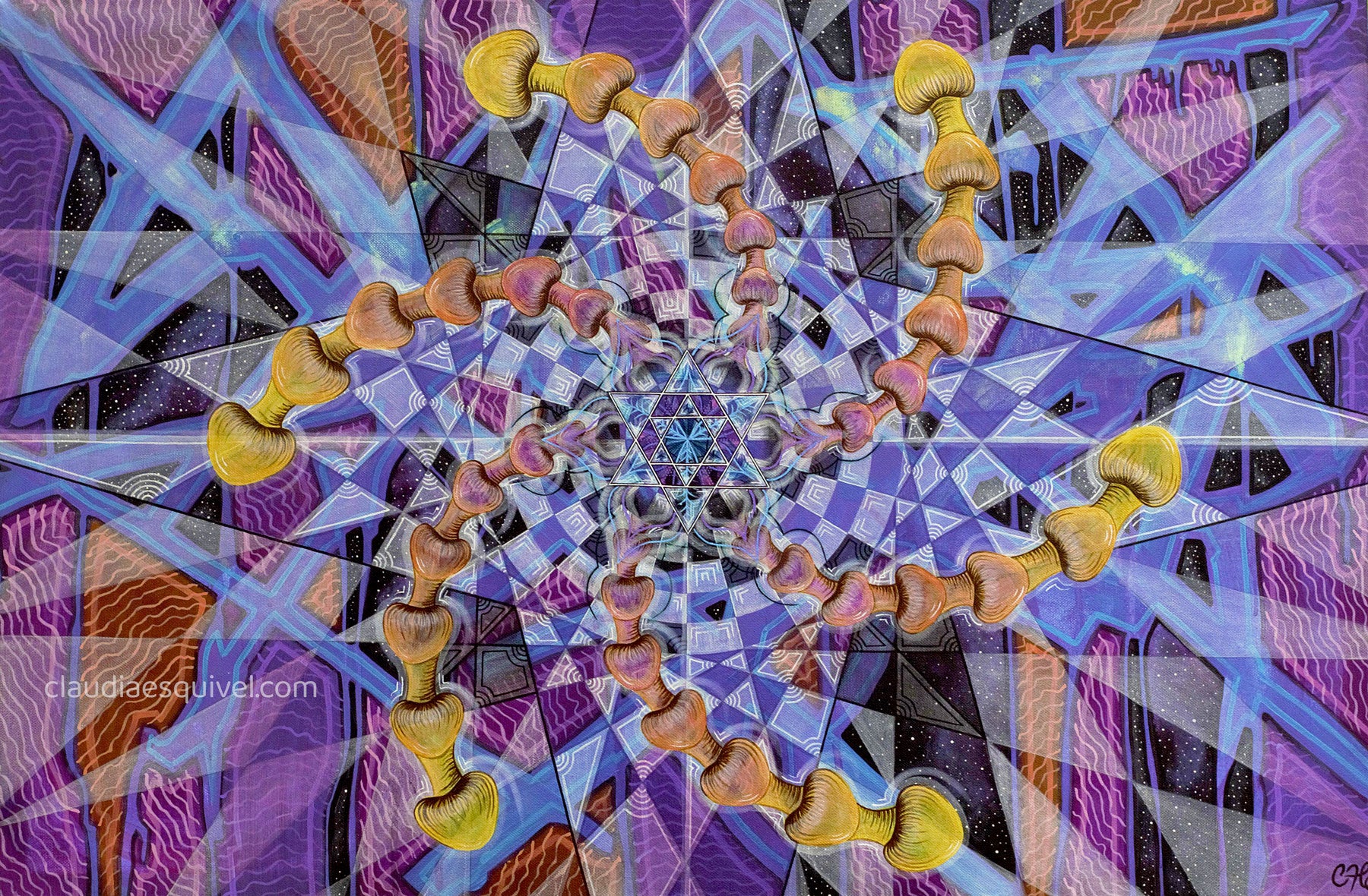 This piece was created in the early years of my awakening, during a time when I was beginning to sense that life held more than what science could explain. I often painted mushrooms because they were the first doorway through which my consciousness expanded and cracked open my perception revealing the unseen layers of reality. As one of my earliest works, this painting holds the frequency of initiation, curiosity, and the moment I began listening to something greater.
